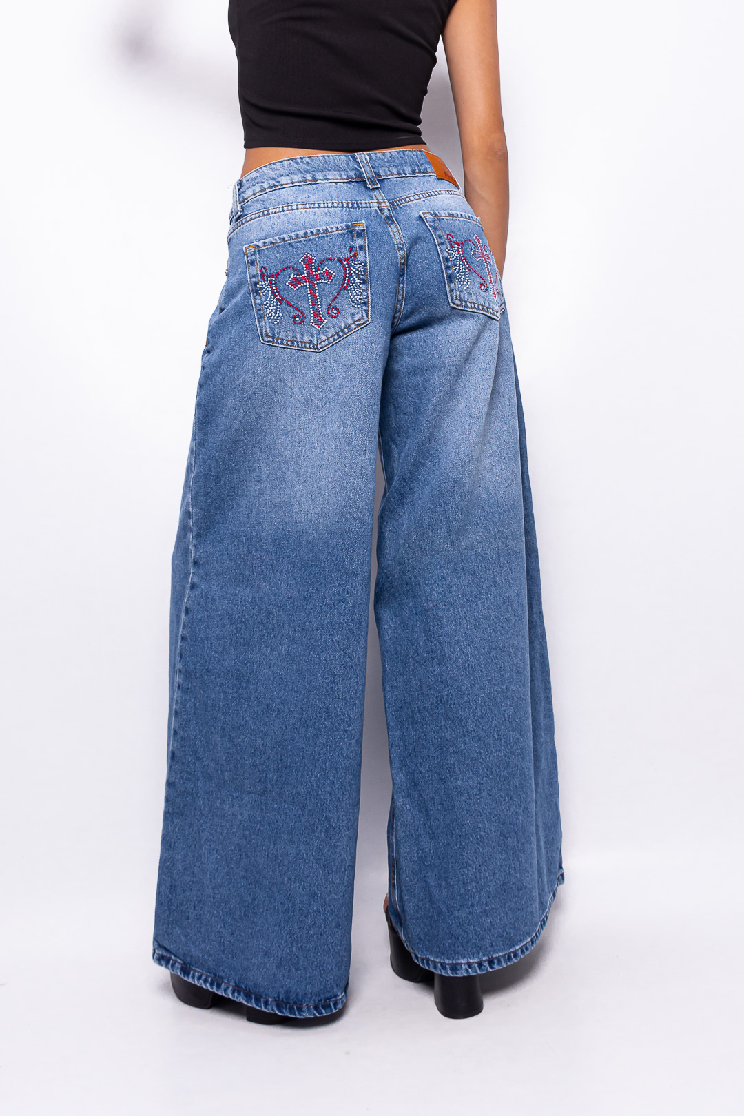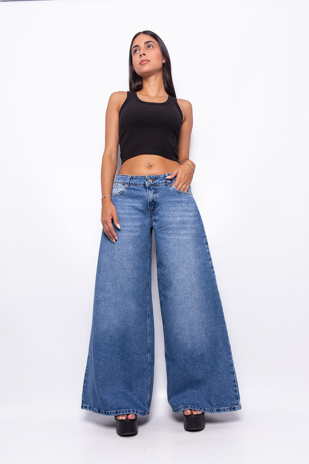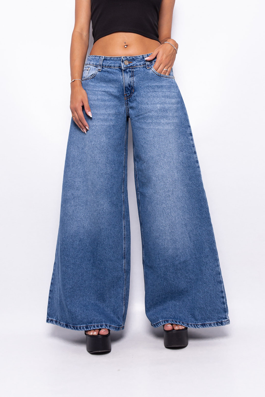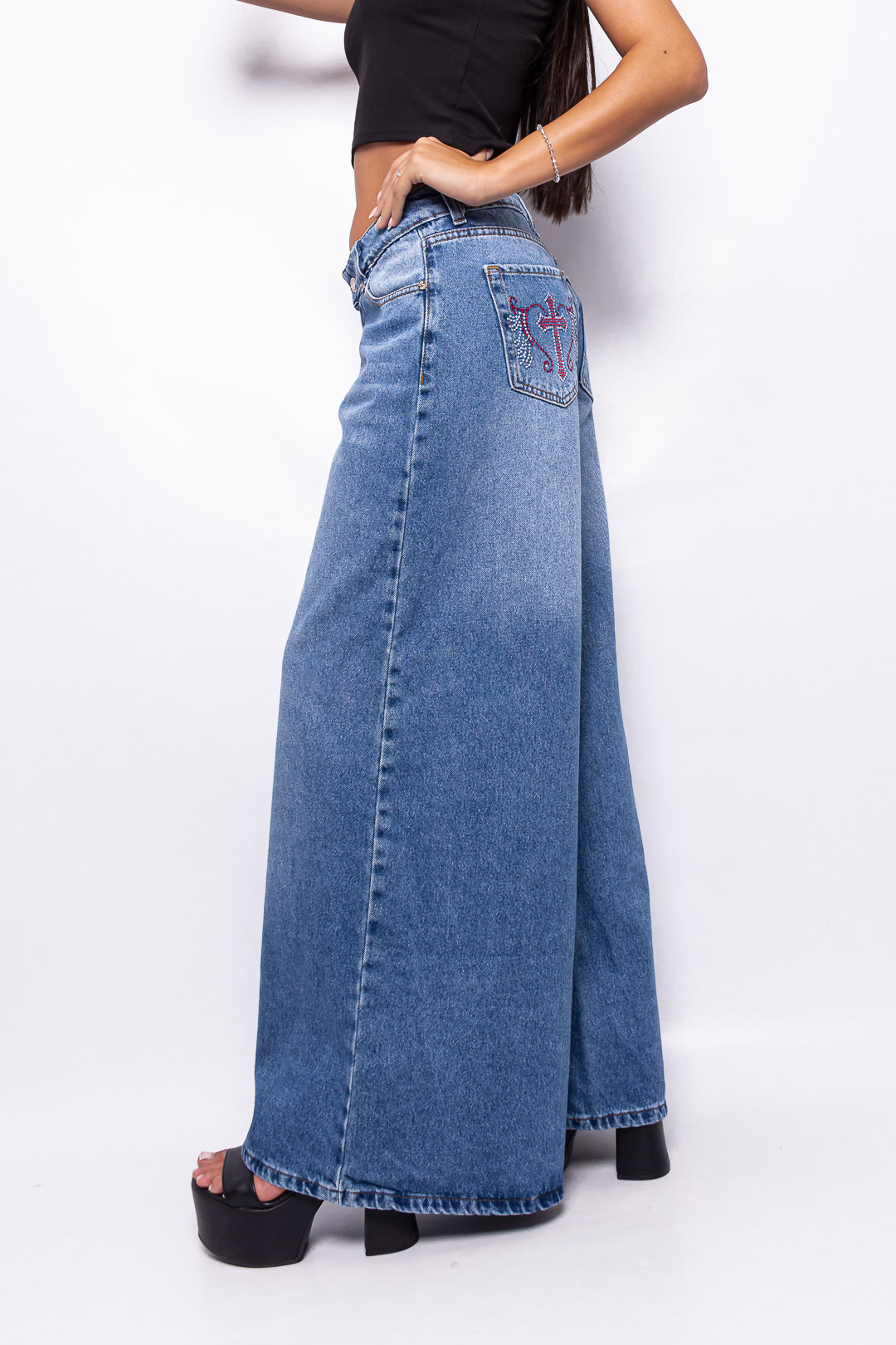 Super Wide Leg Tiro Bajo Azul Nevado con Bordado en Bolsillos Ruedo Normal