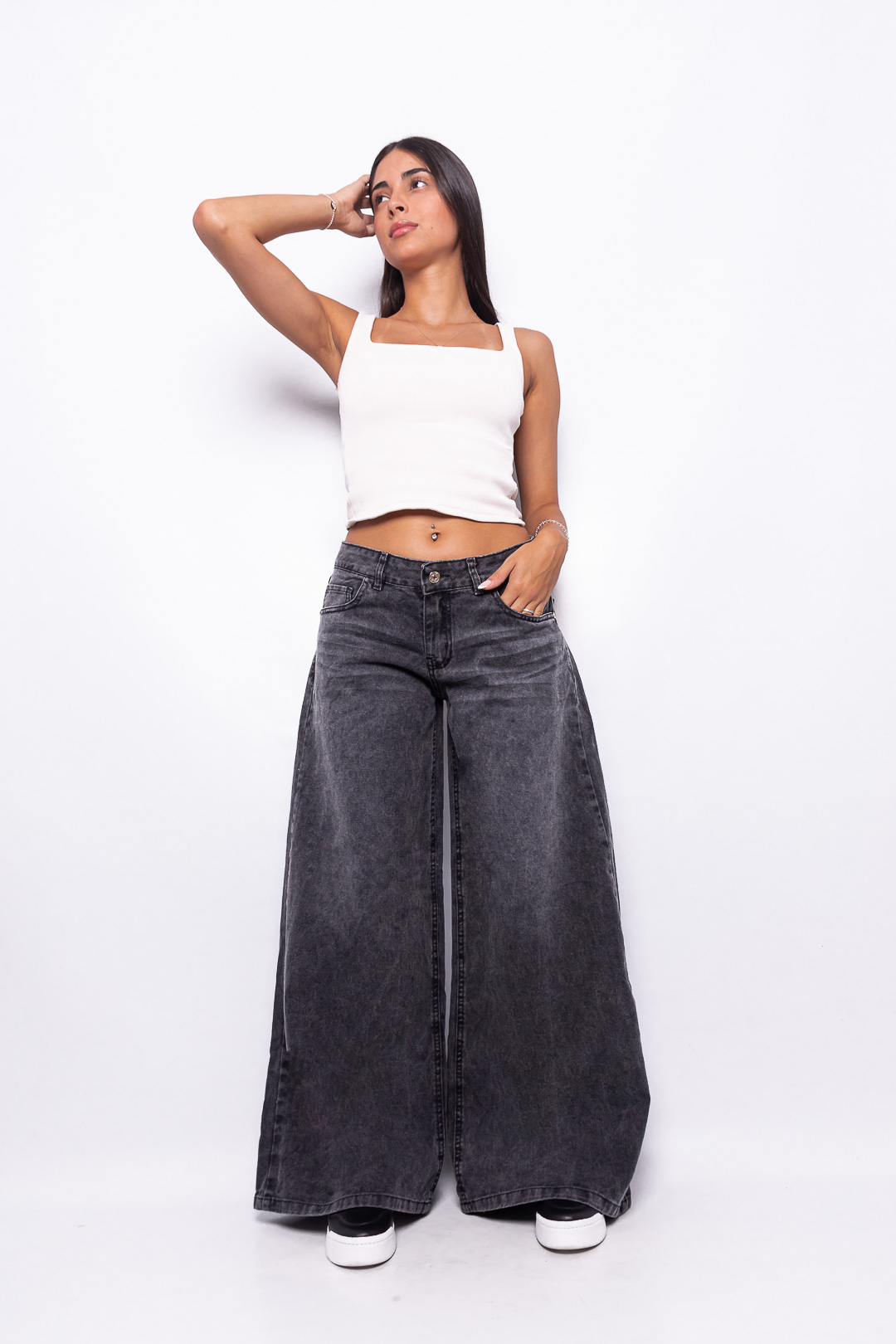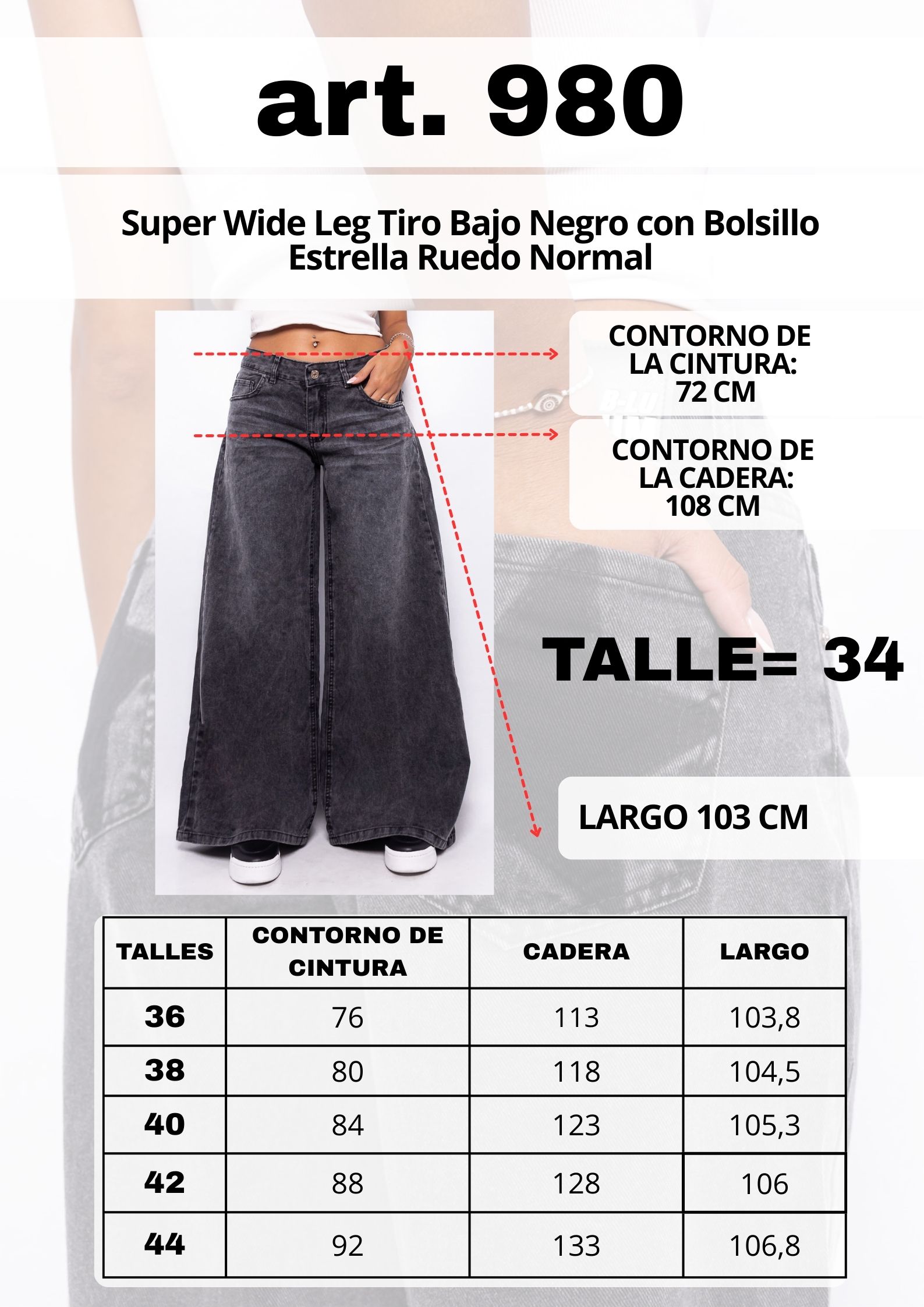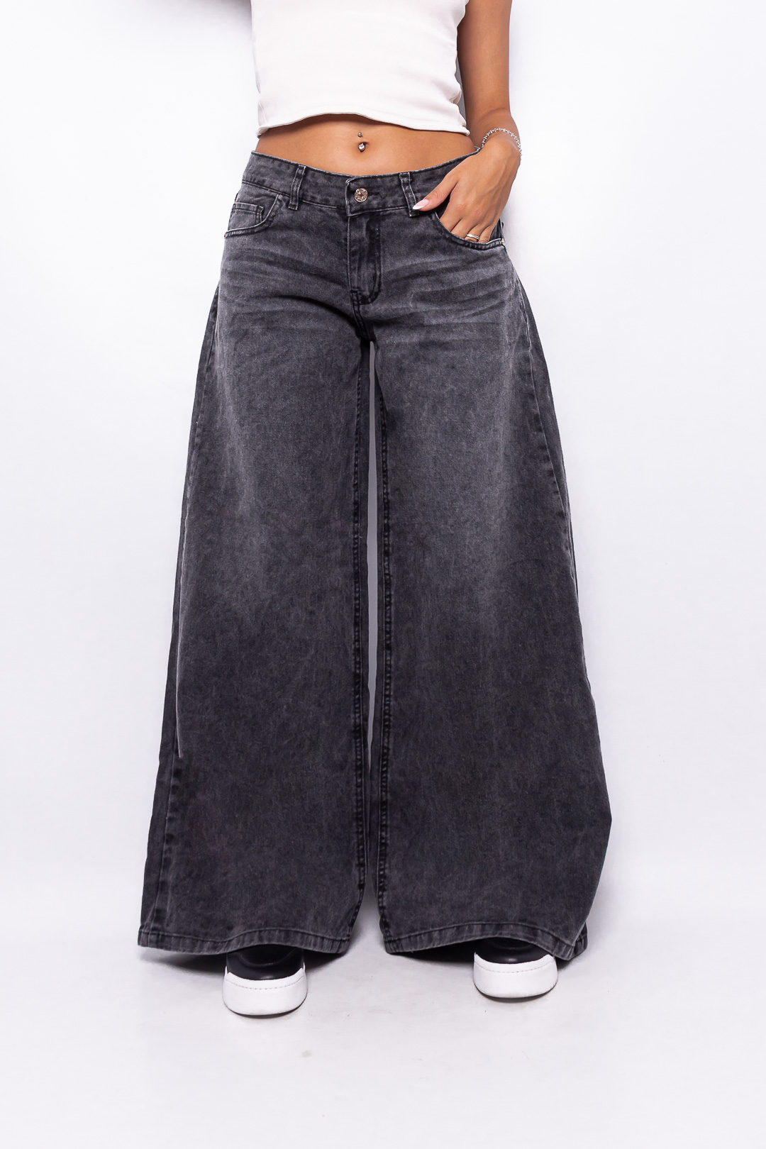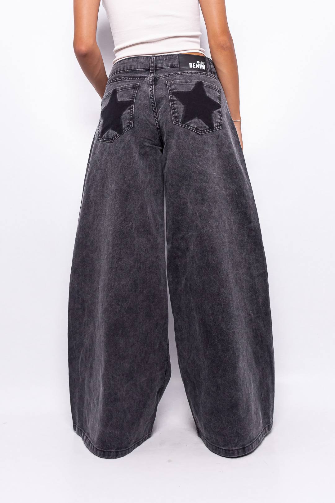 Super Wide Leg Tiro Bajo Negro Nevado con Bolsillo Estrella Ruedo Normal