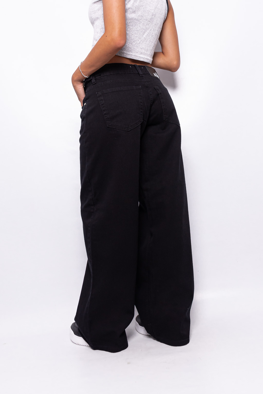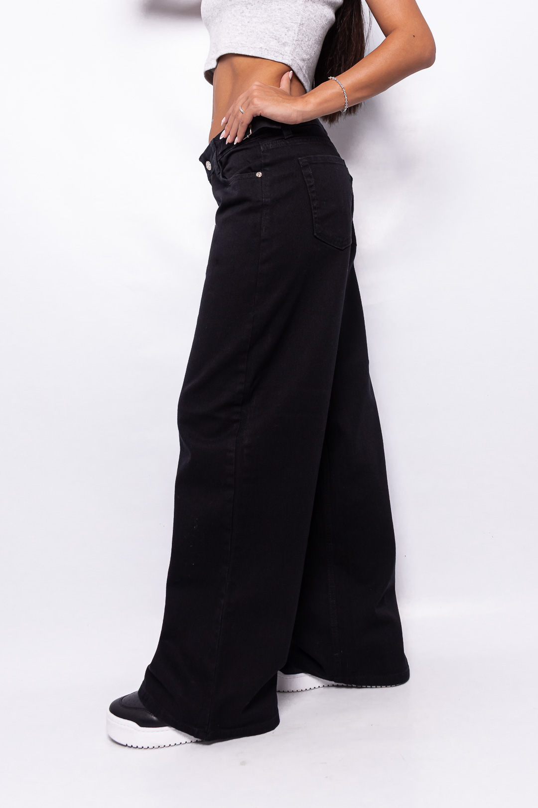Wide Leg Tiro Bajo Negro con Hebillas Ruedo Normal