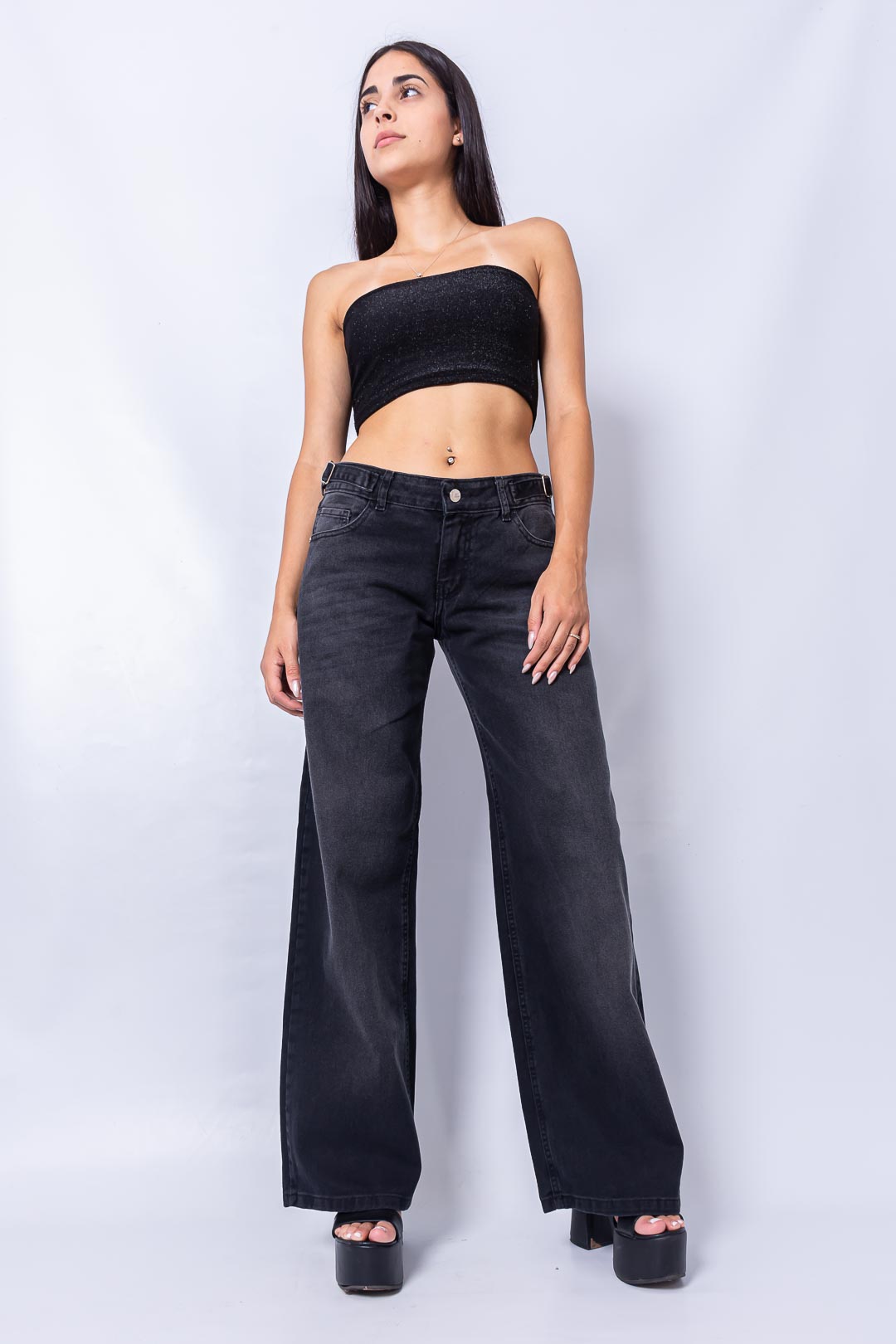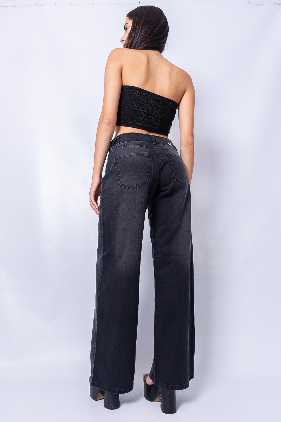 Wide Leg Tiro Bajo Negro Doble Stone Localizado con Hebillas Ruedo Normal